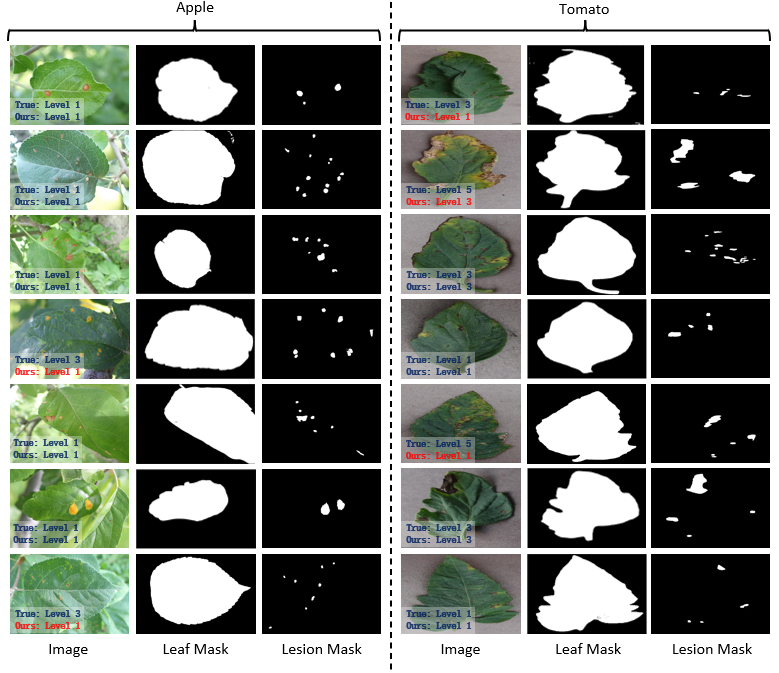 Figure 2: Segmentation renderings of DKP-ADS on non-staple crops. We test it on apple and tomato crops, demonstrating the segmentation performance of our method on non-main crops. The original image shows the true severity level and our method's estimated severity level for each image, with red font indicating prediction errors.