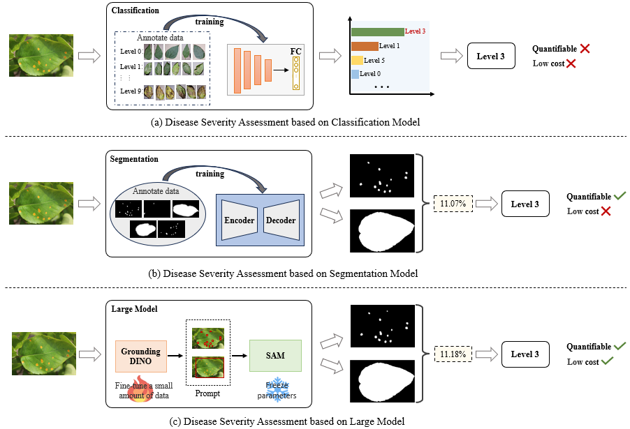 Figure 1: Comparison of several methods for disease severity assessment. (a)Disease Severity Assessment based on classification model. (b) Disease Severity Assessment based on Segmentation Model. (c) Disease Severity Assessment based on Large Model. “Quantifiable” means that disease severity can be evaluated numerically. “Low cost” means that the training model has less data and takes less time.