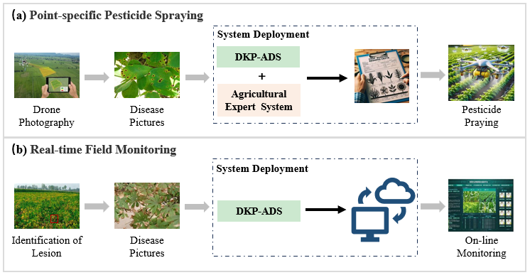 To apply our research in practical scenarios, our disease grading system can play a significant role in real-time field monitoring, smart decision-making, and other areas. First, as shown in Figure 3 (a), we can utilize Internet of Things (IoT) technology and wireless sensor networks to achieve real-time monitoring of field environments. Combined with the DKP-ADS grading strategy, the system can promptly detect diseases and issue warnings, helping farmers take preventive measures and reduce crop losses due to diseases. Real-time monitoring data can continuously be fed back into the model, enabling online learning and adaptive adjustments, which further enhance the robustness and generalization capability of our grading system. Additionally, as shown in Figure 3 (b), our research can support precision agriculture and smart decision-making. Based on our disease grading results, combined with agricultural expert systems and decision support tools, agricultural practitioners can obtain more scientific recommendations for disease control. This allows for precise pesticide application on specific crops and disease categories, reducing pesticide usage, optimizing planting management and resource allocation, and improving crop yield and quality.